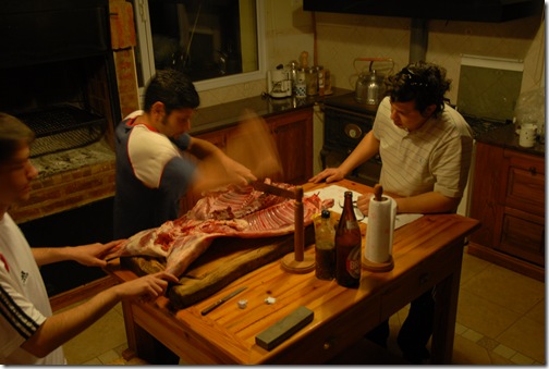 The second night we were introduced to what might just be the greatest production in BBQ-ing history: un cordero asado. Although it translates as “lamb BBQ†we equated it as “lamb crucifixionâ€. For those unfamiliar, please try to familiarize yourself with one at least once in your lifetime because it was absolutely stunning! More people gathered for this asado due to the heavy amount of work required for the 5-hour prep time. Things start to kick off roughly when the carcass is dragged in and heaved onto a cutting board on the kitchen counter. Pablo, the family’s gaucho groundskeeper (and in our collective top 10’s of world’s greatest human beings) took charge of crucifixion portion of the evening. Basically, the little lamb is purchased headless, then the neck must be chopped while on its back, then sliced down the middle in order to rip the rib cage open –thus allowing the four legs to be pinned down in opposite directions. Are you following? Either way you should refer to our photos. After seasoned properly with generous amounts of salt and homemade chimichurri it’s ready to cook over the regularly tended fire pit. It cooks for just under three hours and there are no words to describe the deliciousness that ensues! Of course large quantities of local beer and wine are required consumption while the conversation lasts until the wee hours of the morning.